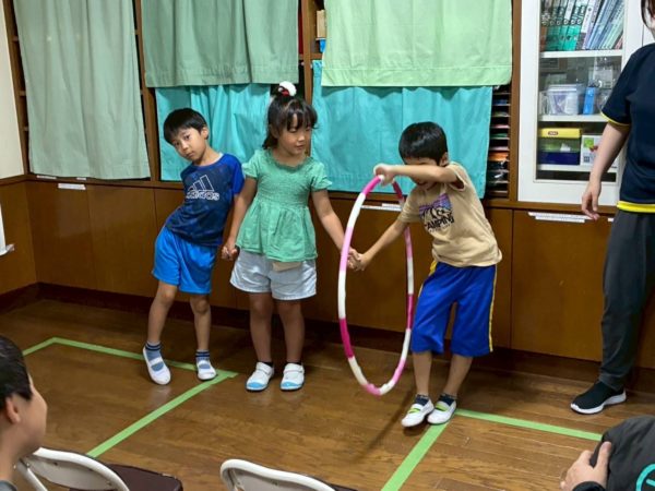 友達と手を繋ぎ、手を離さないようにフラフープを友達に渡しました😊