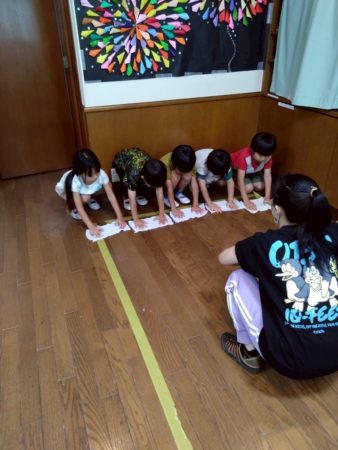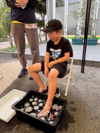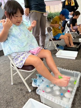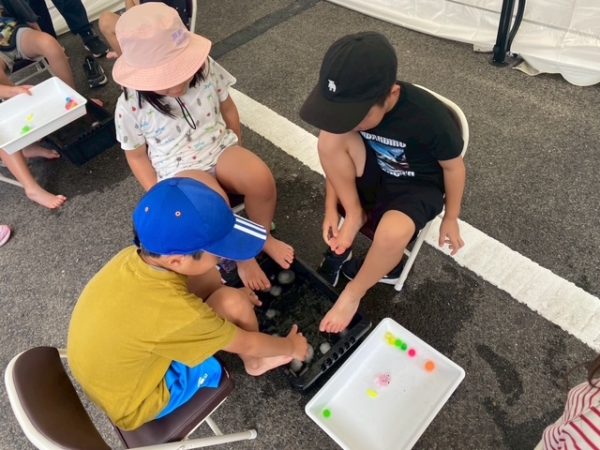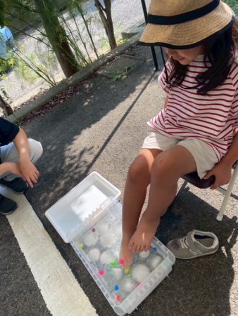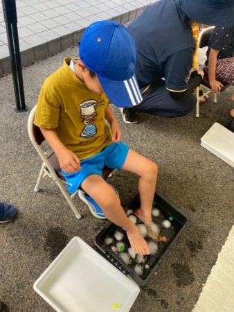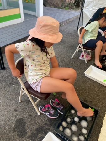 足でスーパーボールを掴んで、何個拾えるかに挑戦しました!暑い夏にクールダウンも兼ねた足の感覚あそびです!