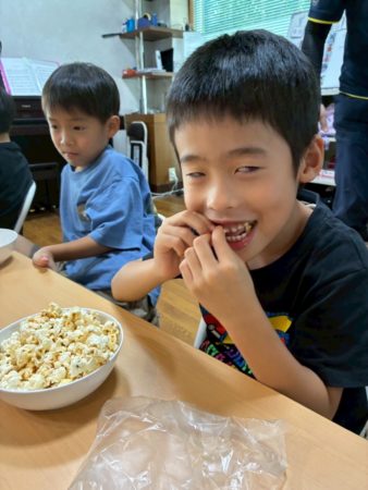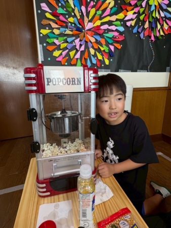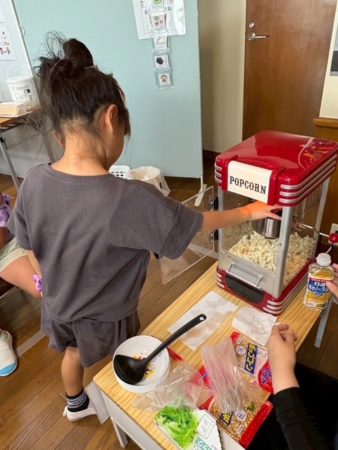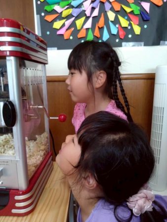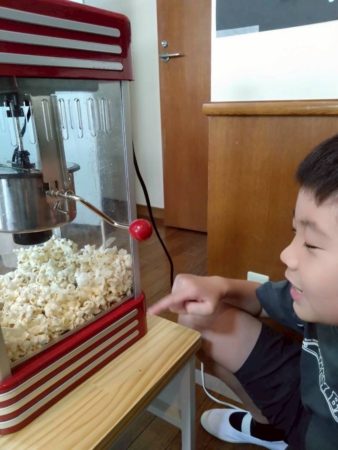 保護者の方より頂いたポップコーンマシーンで作りました😊 みんな興味津々で、はじけ出るポップコーンに釘付けでした☆