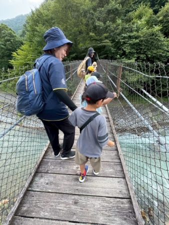 中には、とんぼ取りに夢中な子もいました☆ お散歩の途中で見つけた吊り橋はグラグラ揺れて大変でしたが、手を繋いで渡ることができました!