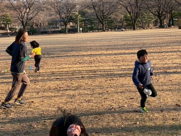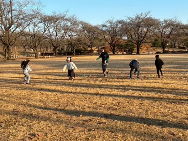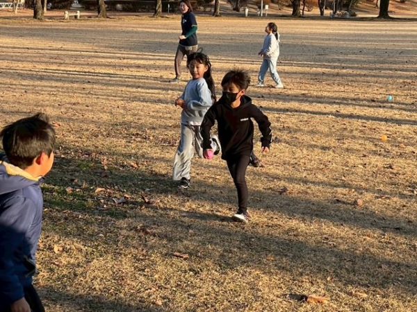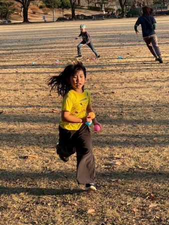 公園の広場で活動をしました♫今回のお宝はカラーボールです✨広場にばら撒かれたお宝を鬼にタッチされないよう逃げながら、自分の陣地まで運ぶ遊びを行いました😊鬼から逃げるのは上手なのに、欲張ってお宝をいっぱい持とうとしている間にタッチされちゃったり、鬼に挟み撃ちされちゃったりするうちに、どうすればいいか考えて取り組めるようになっていきました✨