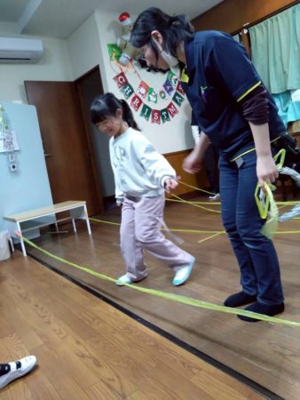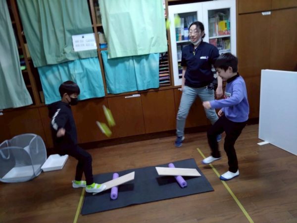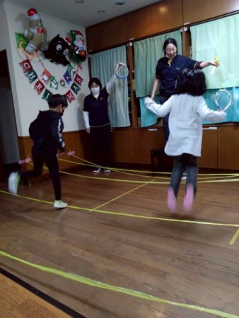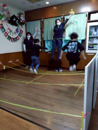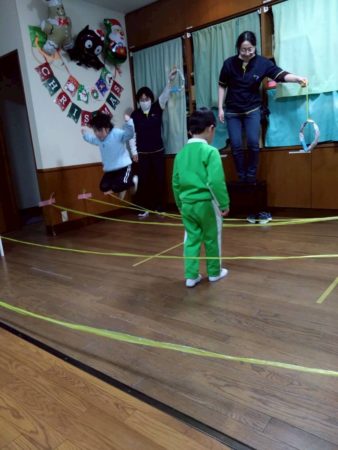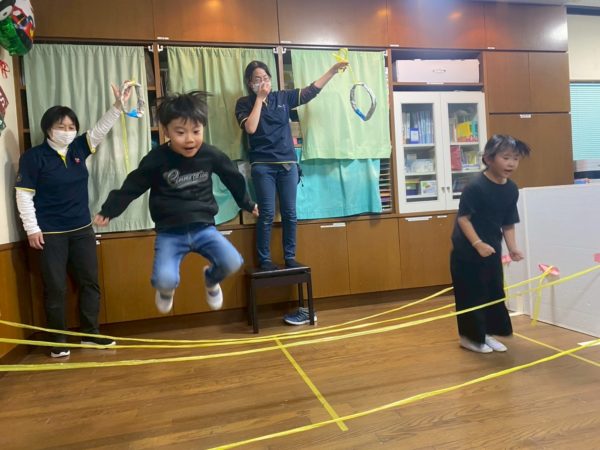 スズランテープの線の上を両足ジャンプで飛び越え、下半身の力を鍛えました✨端まで行ったらぶら下がっているフープにタッチして、またジャンプで戻ってきたらゴールです!みんなルールをしっかりと意識して取り組めていました(#^.^#)