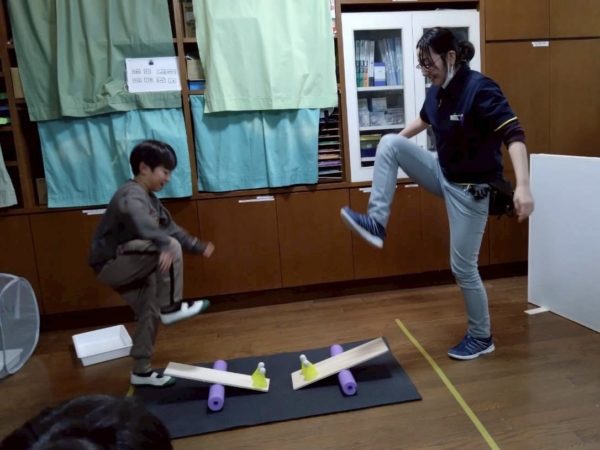 板とプールスティックでシーソーを作り、シャトルを乗せた状態から反対側を思い切り踏んで、羽根を見事キャッチできました👏