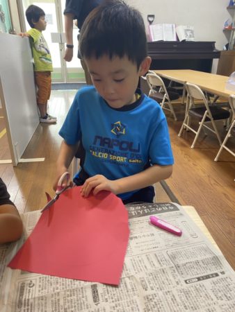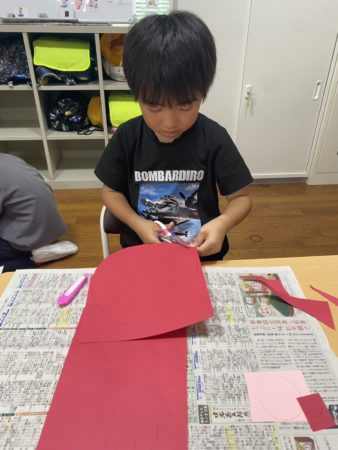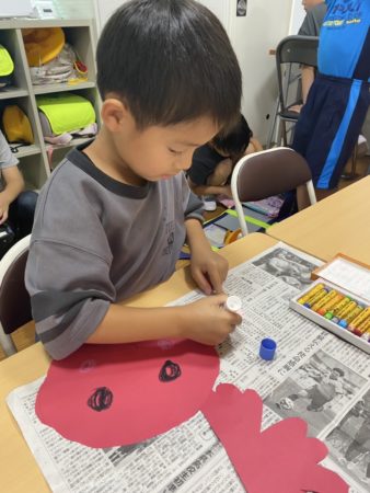 夏祭りのたこ焼き的当てで使う、たこの的を作りました☆まずは画用紙をたこ型に切り、たこの顔を描いて、最後にシールを貼って、吸盤を作ったら完成です(#^^#)