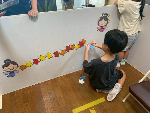 隠された星を探し、見つけた星を並べて織姫と彦星を星の道で繋げてあげる遊びをしました♪