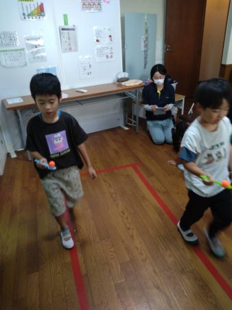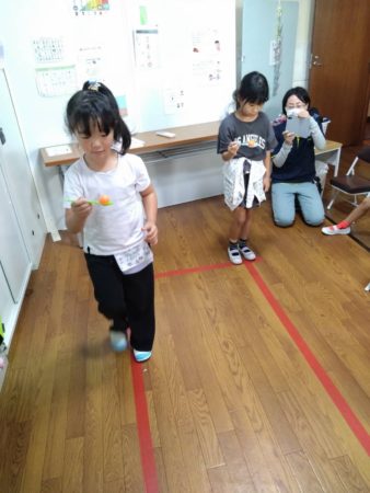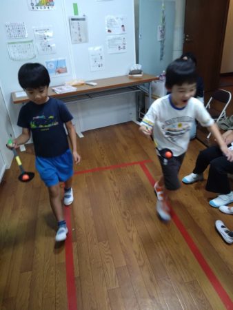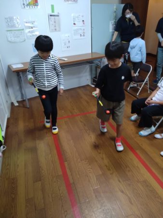 お玉やスプーンを使ってピンポン玉を運びました😊手元に注目するだけでなく線の上をバランスを取りながら歩くことができました🎵