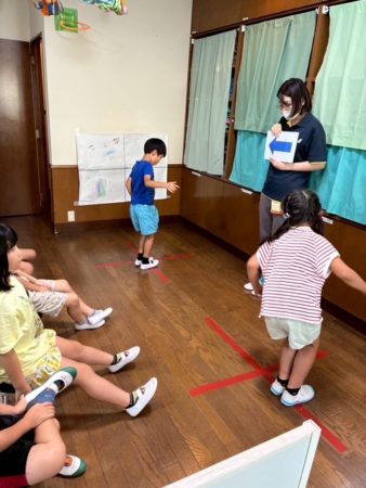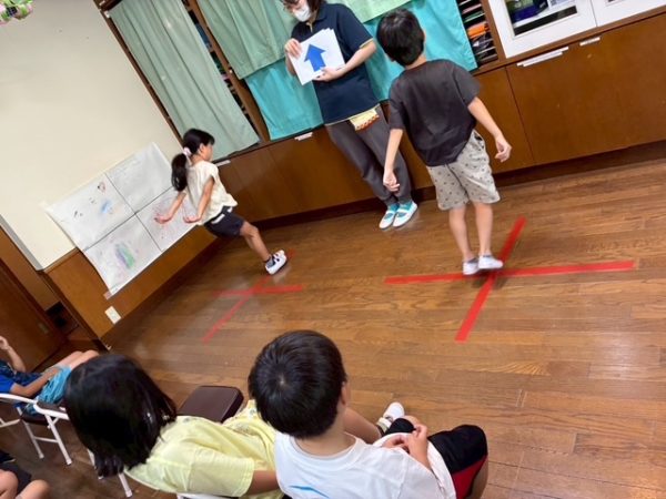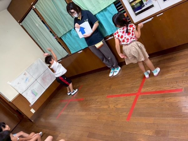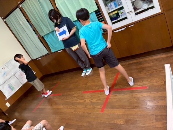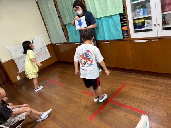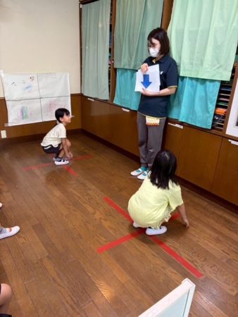 職員が出した矢印の向きにジャンプをしました!ジャンプしたりしゃがんだりしたりと動きがたくさんありました。